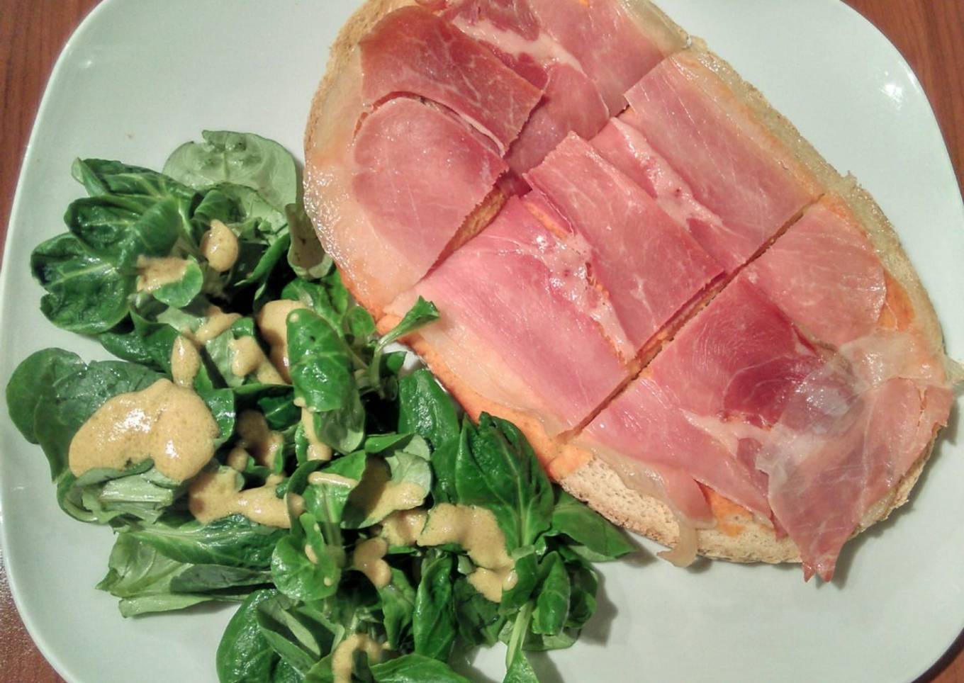 Bruschetta de salmorejo y jamón con ensalada de canónigos