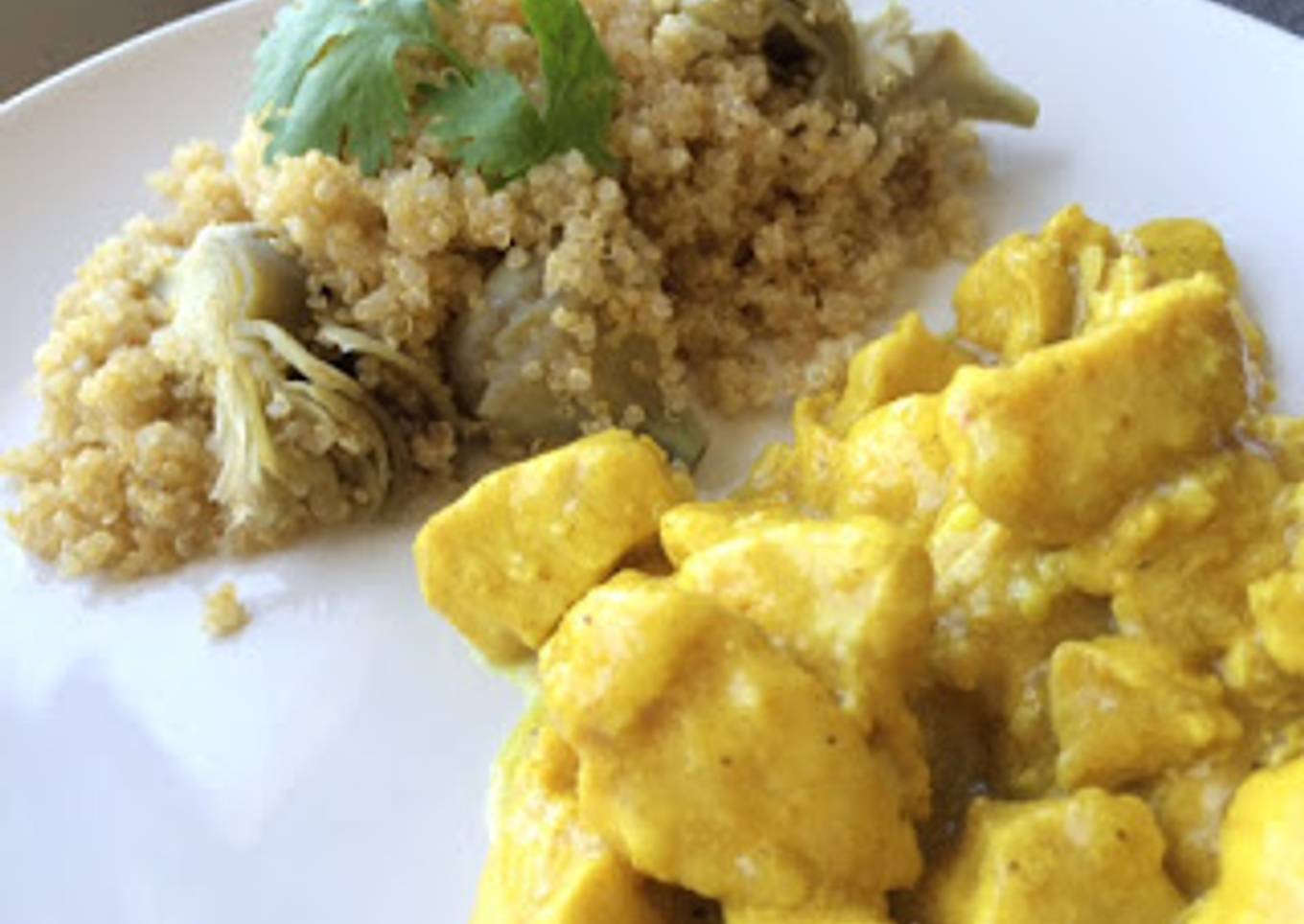 Pollo con canela y dátiles con ensalada de quinoa y alcachofas