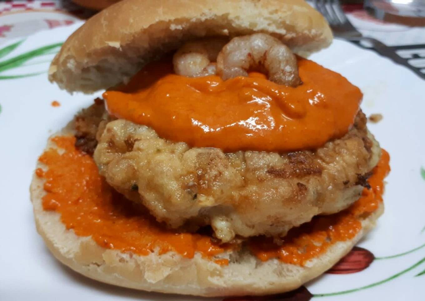 Hamburguesa de bacalao con salsa de pimiento del piquillo