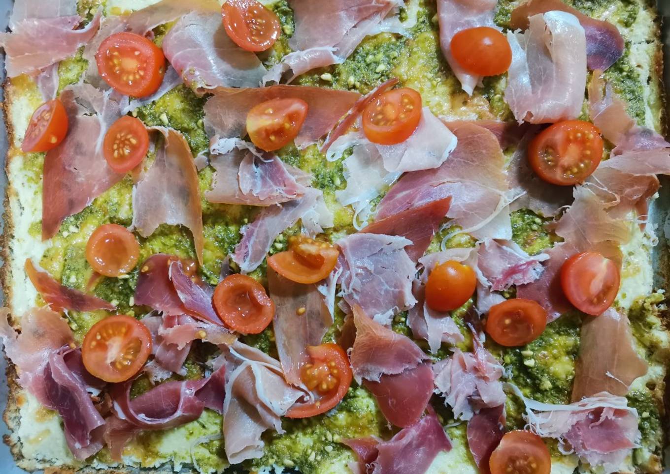 - Dejamos enfriar un poco y le ponemos los ingredientes que nos apetezca encima. En mi caso pesto de albahaca como base (como si fuera el tomate en una pizza normal). Jamón serrano y cherrys partidos por la mitad.