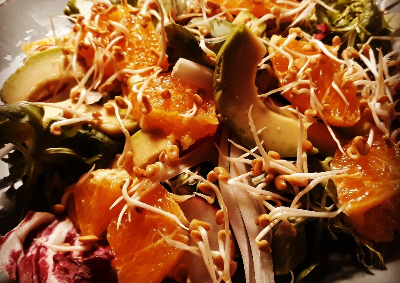 - Ponemos de base el mezclum, seguimos con la cebolla tierna cortada a tiras, luego el aguacate también a tiras finas, la naranja a tamaño bocado y por último los brotes de soja. Pizca de sal y pimienta negra molida (a quien le guste) y un poco de aceite. Listo!!! #buenprovecho #lacuinadenfusa1973