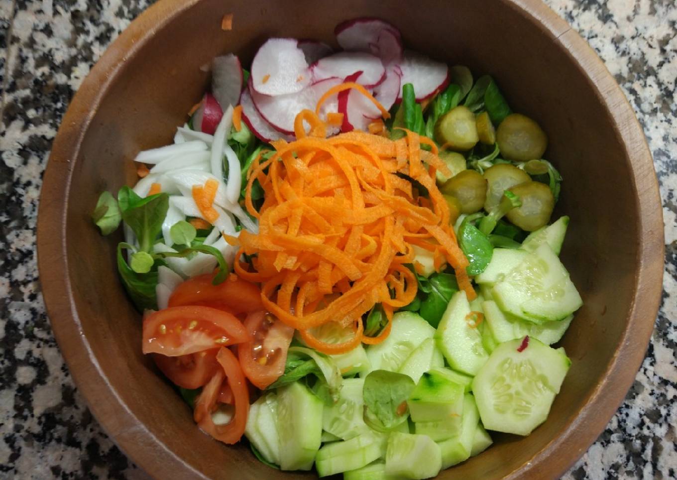 - Preparamos los ingredientes. Echamos los canónigos en un bol, y cortamos la cebolleta en julianas, el rabanito en rodajas muy finas, el pepino y el tomate en trozos, 1 pepinillo en vinagre escurrido y cortado en rodajas. Y la zanahoria yo la pele y la corte con el espirilizador para tener espirales de zanahoria.