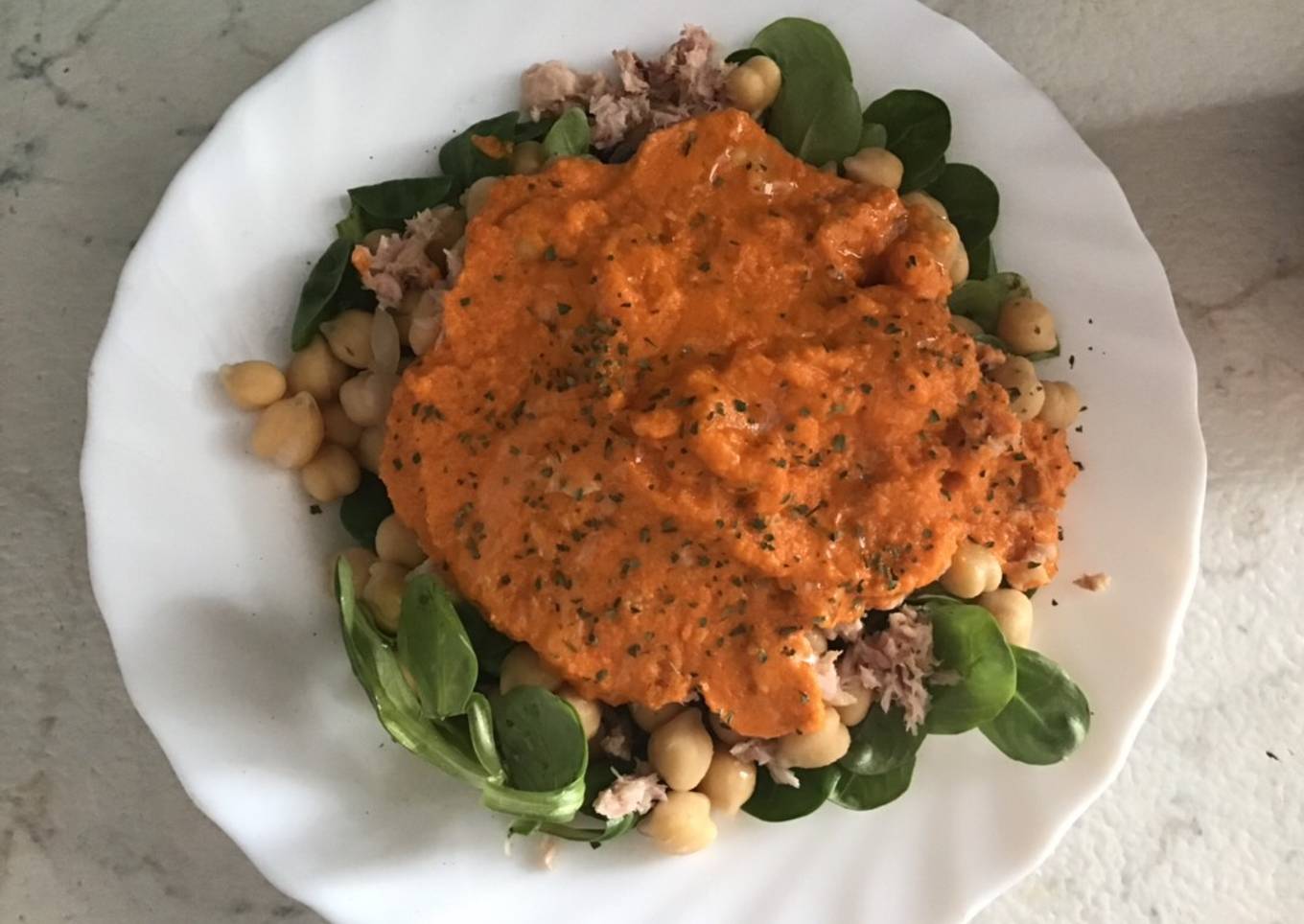 Ensalada de garbanzos con atún, canónigos y salsa de verduras