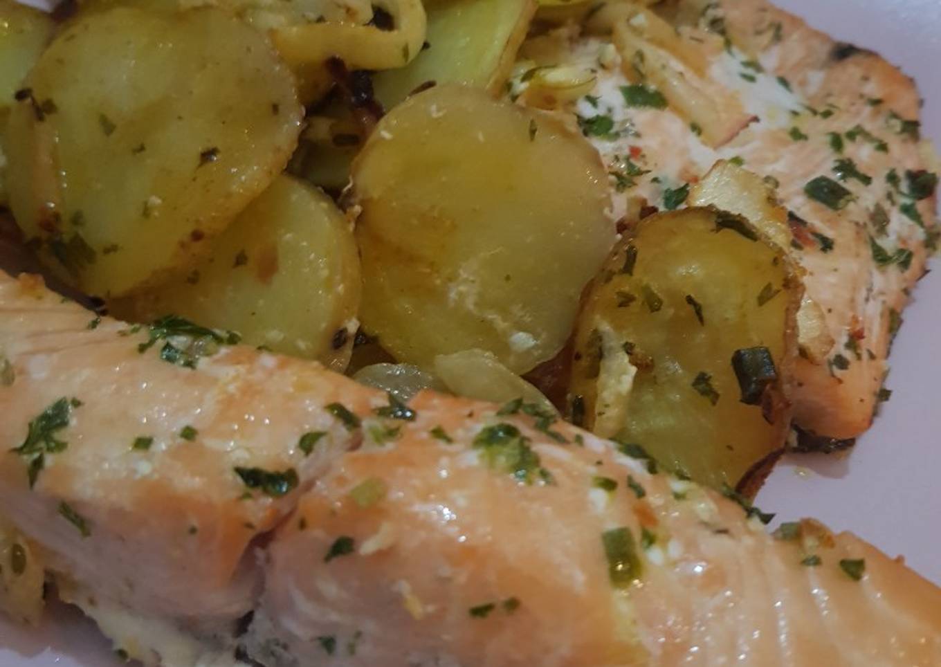 - Las ponemos en la bandeja del horno y horneamos unos 20 minutos, ahora ponemos el salmón previamente salpimentado y le ponemos cebollino
