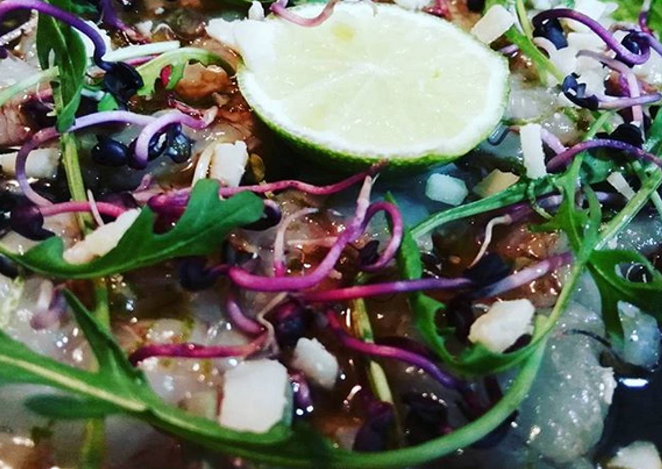 Carpaccio de gambas, con rúcula, raíces de rábano y grana padano