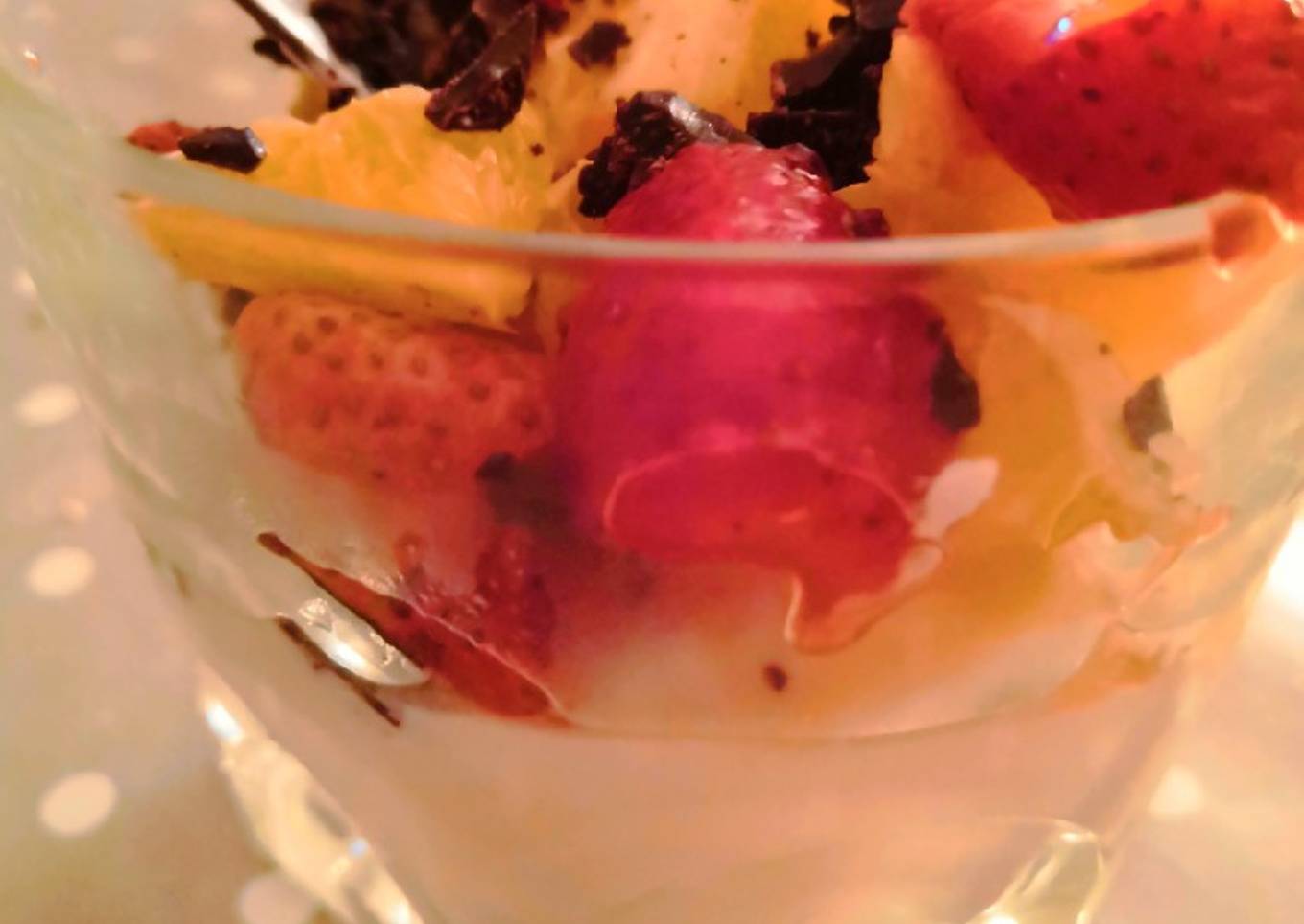 - Vaciar el gogurt en vaso y añadimos las fresas y la naranja troceada. Le rallamos un poco de chocolate por encima y... Guuahala!