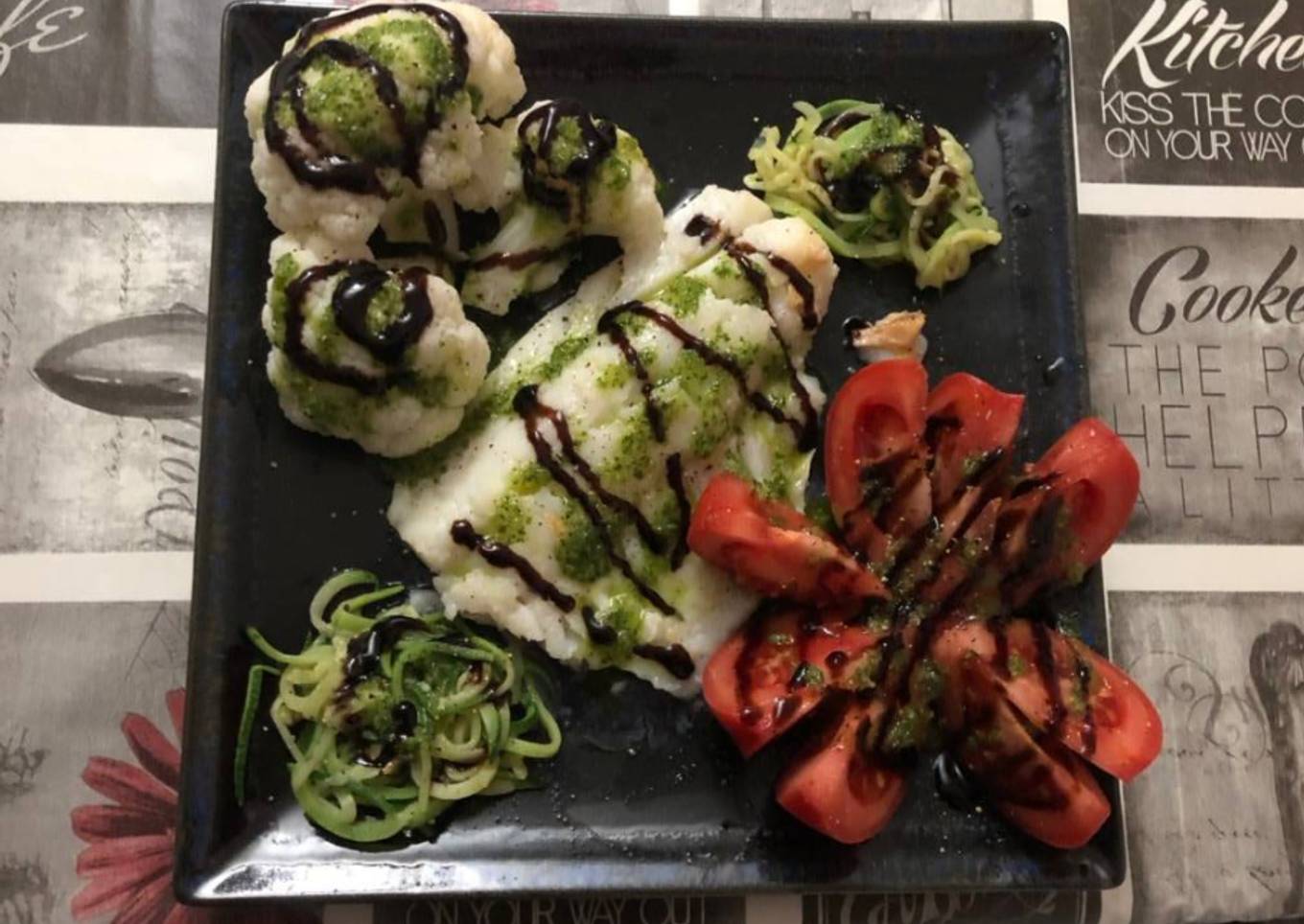 Bacalao a la plancha con espaguetis de calabacín tomate natural y coliflor hervida