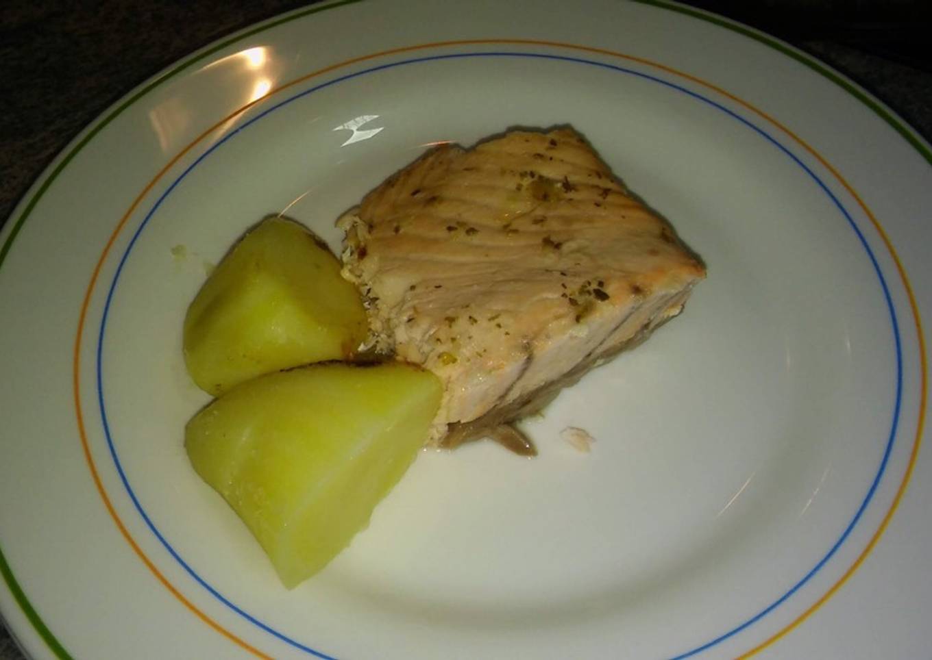 - Se sazona el salmón con sal, ajo en polvo y orégano. Después se coloca en una fuente de horno donde se ha puesto una base de aceite de oliva (2 cucharadas)