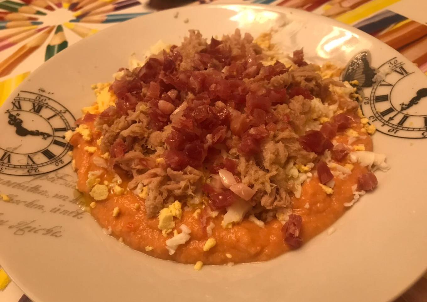 - Sacar del frigo, echar en un plato y añadirle el huevo, (yo lo he rallado) jamón, el atún y un chorrico de aceite de oliva por encima y listo para comer!!!!!