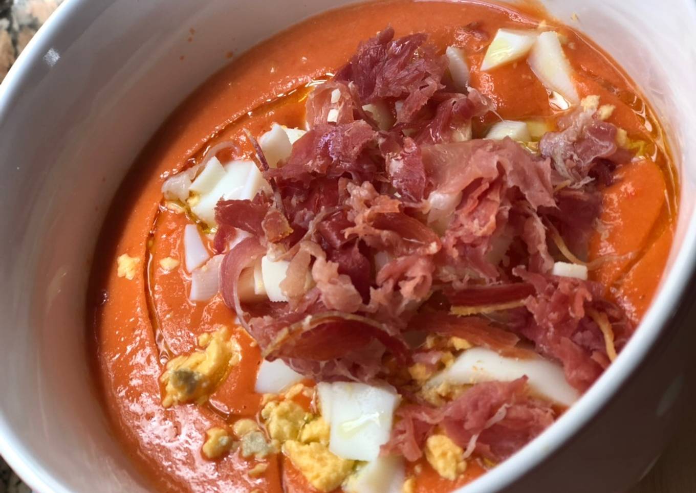 - Por último, pasamos por un colador, si vemos que se nos han quedado algunas semillas del tomate, pero esto es opcional. Servimos, y emplatamos con el huevo cocido picado, el jamón y un buen chorro de aceite de oliva. A disfrutar ! 🤤