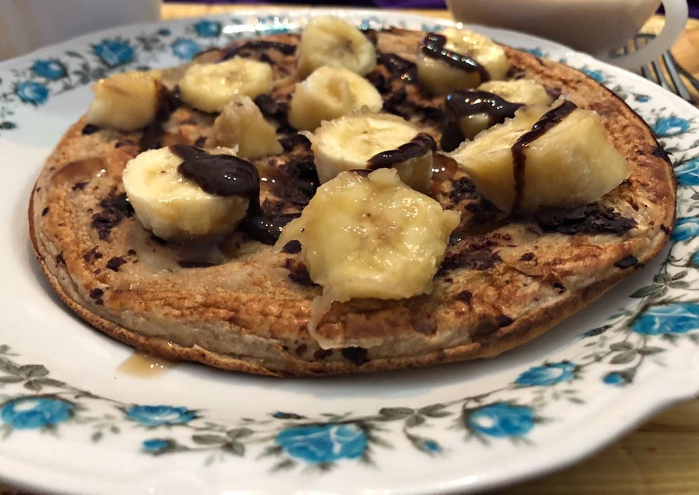 - Calentar la sartΓ©n con un poco de aceite de oliva, machacar el medio plΓ‘tano maduro y aΓ±adir al shaker con el resto de los ingredientes. Mezclar bien como si fuese un batido y aΓ±adir a la sartΓ©n a fuego lento unos 5 minutos (yo le doy la vuelta cuando apago el fuego y la tapo) por encima he puesto el otro medio plΓ‘tano y sirope de caramelo y chocolate.