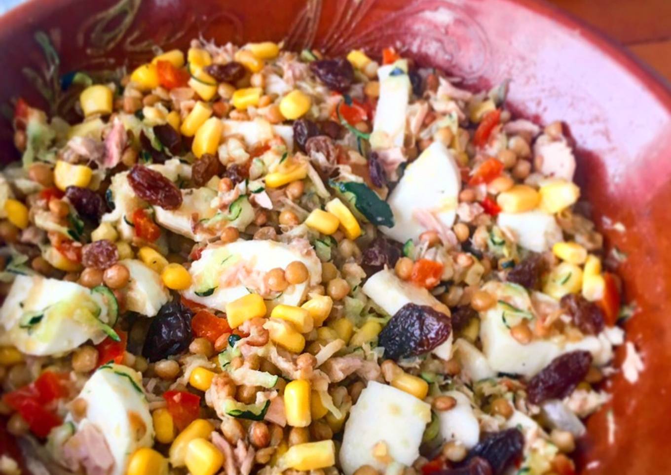 - Por último... añadimos las uvas pasas y aliñamos con un chorrito de aceite de sésamo y vinagre de manzana, removemos y reservamos un ratito en la nevera antes de consumir