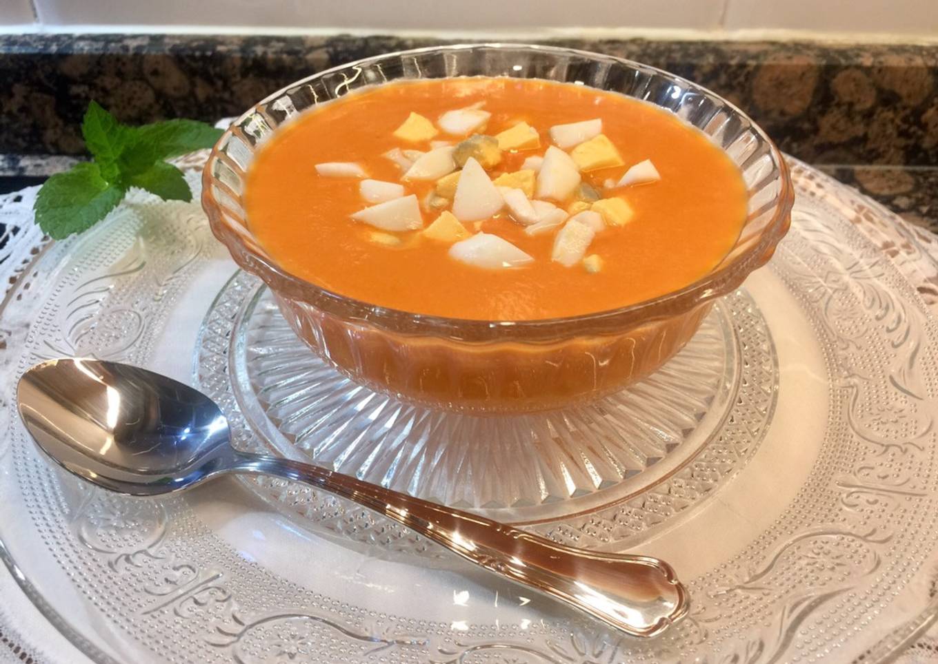 Es un salmorejo muy delicioso, suave y muy resfrescante, a pesar de no llevar pan, hemos conseguido el espesor adecuado para este tipo de plato. Muy rápido y sencillo de hacer! Solo necesitamos 5 ingredientes y obtendremos un salmorejo realmente estupendo!