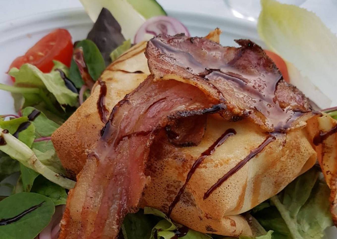 - Luego servir sobre tomates y lechugas frescas y decorar con el tocino cocido. Yo lo adereze con crema balsámica