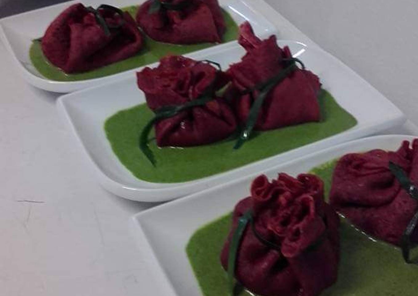 - Después de tener todo pronto armamos las creep en forma de bolsa fritamos tiras de verdeo un poco y atamos con esas tiras la creep y salseamos con la crema y listo