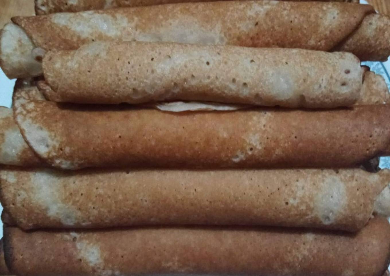 - En una sartén o crepera poner un poco de masa y mover la sartén o crepera para expandir la masa.