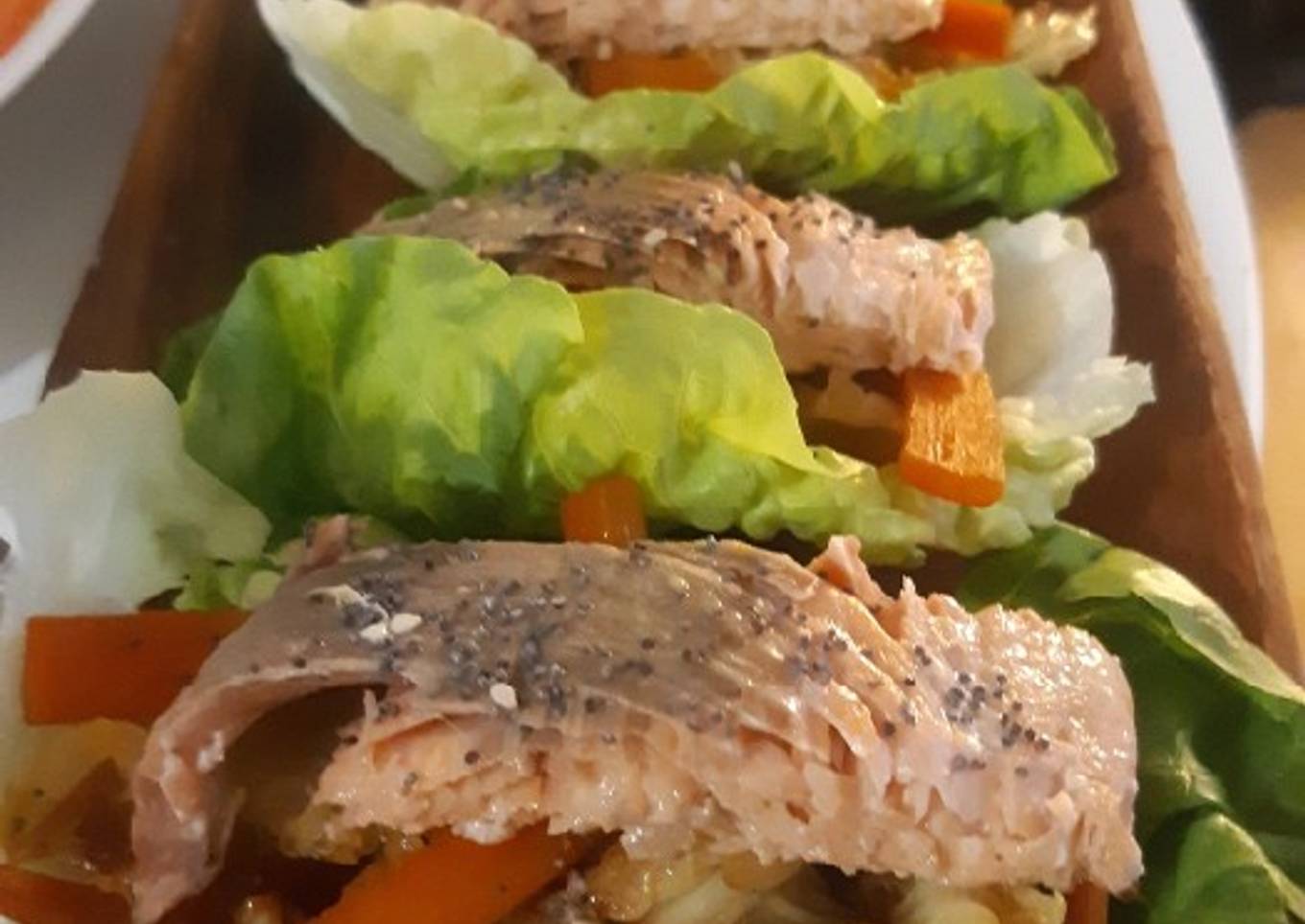 - Lavar y colocar las hojas de los cogollos. Rellenarlos con el sofrito y coronar con los trozos de salmón.