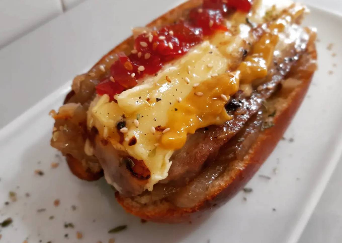 - Emplatamos poniendo en la base del brioche la cebolla caramelizada, encima la butifarra con el queso y encima dos tiras, una de mermelada de tomate y otra de mostaza.