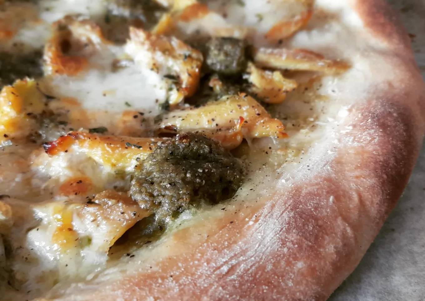 Pizza de pollo, burrata y salsa pesto