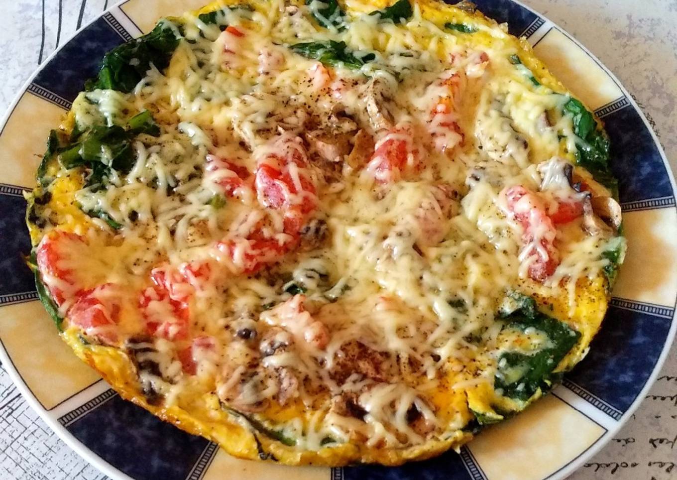 - Ponemos en una sartén con aceite y añadimos un puñado de espinacas, los champiñones, el tomate picado a trocitos pequeños, el queso rallado, sal y pimienta, tapamos y en 10 minutos ya estará lista para comer, (no hace falta darle la vuelta)